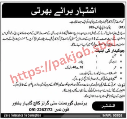 Government College Peshawar has officially announced new government job opportunities for 2026, offering a great chance for candidates seeking stable public sector employment in Khyber Pakhtunkhwa (KPK). According to a recent newspaper advertisement, applications are invited for the post of Chowkidar (Security Staff) at Government City Girls College Gulbahar, Peshawar.