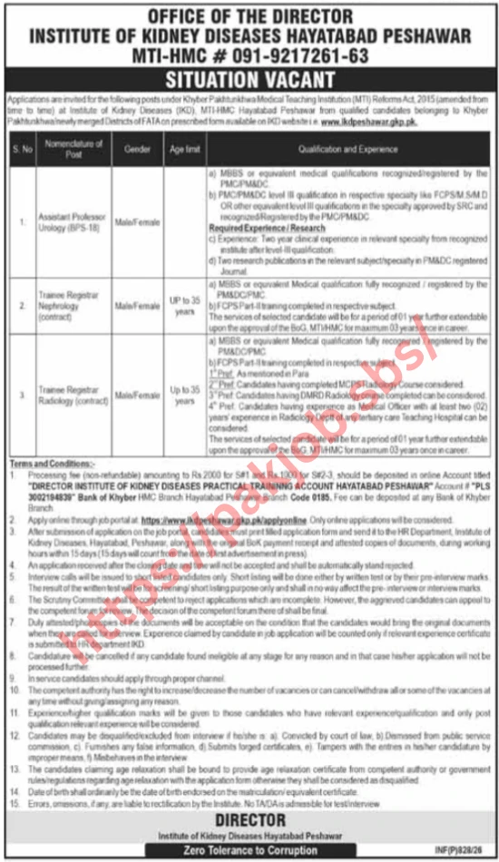 The Institute of Kidney Diseases (IKD) Peshawar, working under the Medical Teaching Institution (MTI) Hayatabad Medical Complex (HMC), has officially announced new government medical vacancies for 2026. These latest openings were advertised in a leading newspaper and offer excellent career opportunities for qualified medical professionals in Khyber Pakhtunkhwa (KPK).