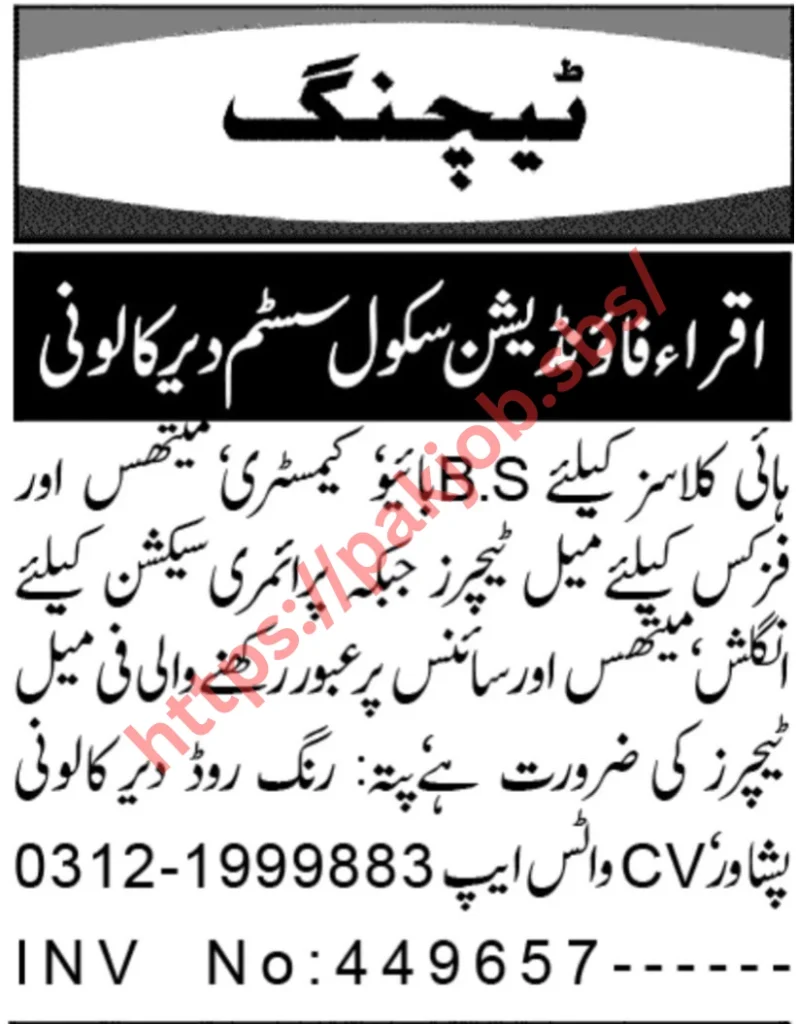 Iqra Foundation School System, located near Ring Road Peshawar, is known for providing quality education and maintaining strong academic standards. The school is currently hiring teachers for various science and general subjects to strengthen its academic team.