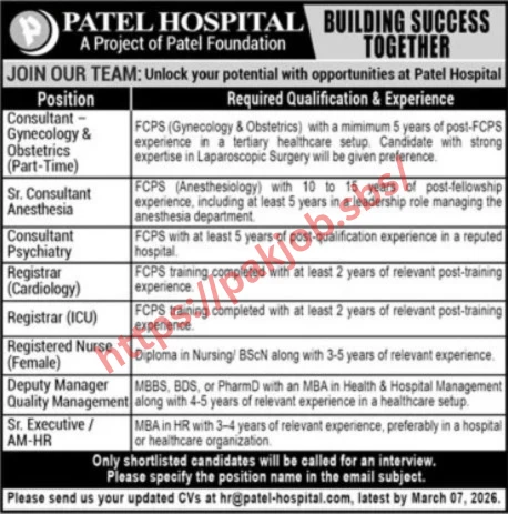 Patel Hospital Karachi has opened fresh career opportunities for qualified healthcare and administrative professionals in 2026. According to a recent newspaper advertisement, the hospital is inviting applications for multiple positions across clinical and management departments.