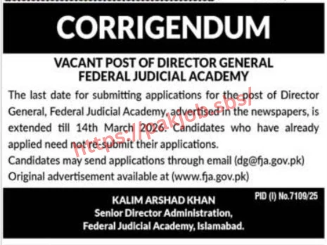Federal Judicial Academy is responsible for providing professional training and research opportunities for judges, judicial officers, and legal professionals across Pakistan. The newly announced position aims to strengthen leadership and improve institutional development within the academy.