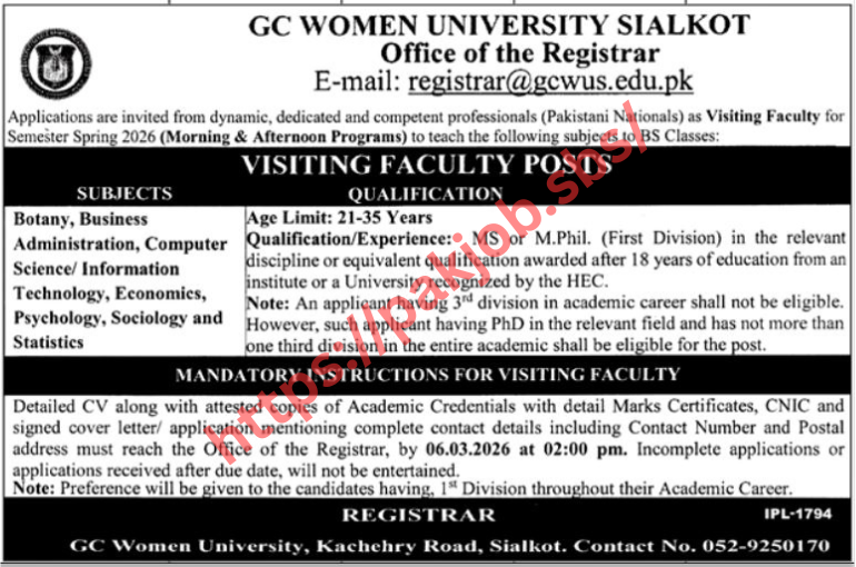 If you are planning to apply for GC Women University Sialkot Jobs 2026, ensure your documents are complete and submitted within the deadline. Whether you are an experienced professor or an emerging academic professional, this is a valuable opportunity in Pakistan’s higher education sector.