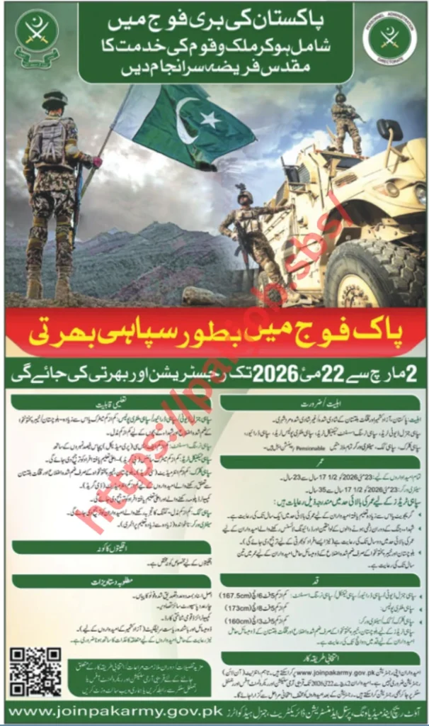 The Pakistan Army has officially announced its latest recruitment drive for 2026, offering opportunities for young candidates to serve the nation in multiple soldier-level positions. According to the advertisement published on 23 February 2026 in the Daily Ausaf newspaper, applications are invited for Sipahi (General Duty), Sipahi Driver, and Sipahi Military Police across major recruitment centers in Pakistan.