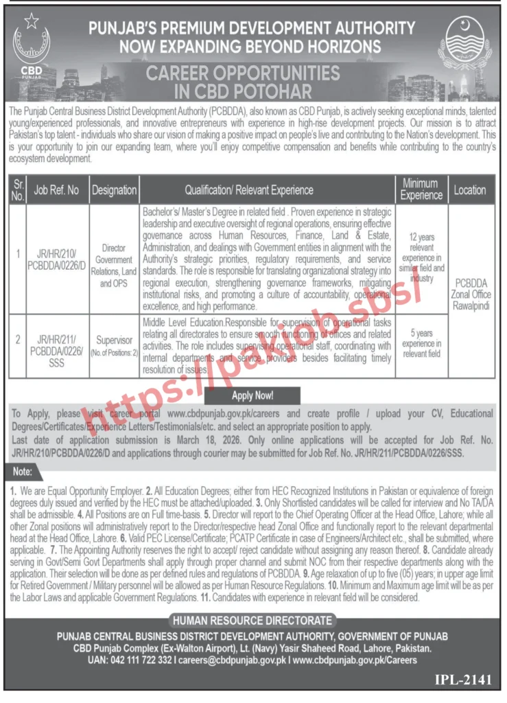 The Punjab Central Business District Development Authority (PCBDDA), widely recognized as CBD Punjab, has announced fresh recruitment for 2026. The latest advertisement, published in the Pakistan Observer Newspaper, highlights multiple openings in management and supervisory roles based in Lahore and Rawalpindi, Punjab.