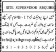 A reputed organization, Ajaib Group, is hiring a Site Supervisor for its ongoing and upcoming construction projects in Islamabad (B-17 area). Candidates with relevant qualifications and basic field knowledge are encouraged to apply.