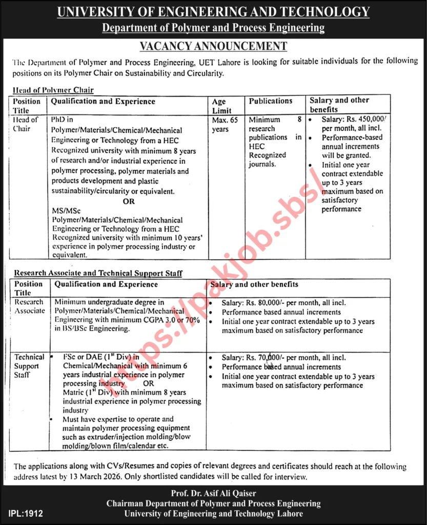 The University of Engineering and Technology (UET) Lahore has officially announced new government job opportunities for 2026. According to a recent newspaper advertisement published on 24 February 2026, multiple vacancies are available including Head of Chair, Research Associate, and Technical Support Staff.